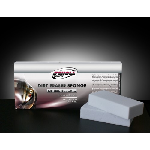 Scholl Concepts high performance Dirt Eraser Sponge removes stubborn dirt on vehicles without the need for strong, solvent-based cleaners. The unique abrasive nano-structure of the foam pad will allow easy removal of tough dirt from almost any surface. For use, simply moisten the sponge with water. Particularly applicable for alloy and steel rims, interior plastic parts, artificial leather, etc. Ideal for erasing set-in dirt, grime and insect contaminations.