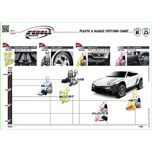 Plastic & Rubber Dressing Chart: Gloss level and product guide for plastic and rubber surfaces with Scholl Concepts.