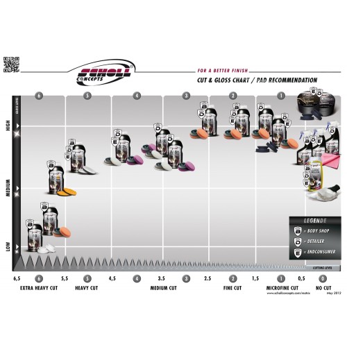 Cut & Gloss Chart: Information on the cut and gloss levels of the Scholl Concepts compound range, with pad recommendations.